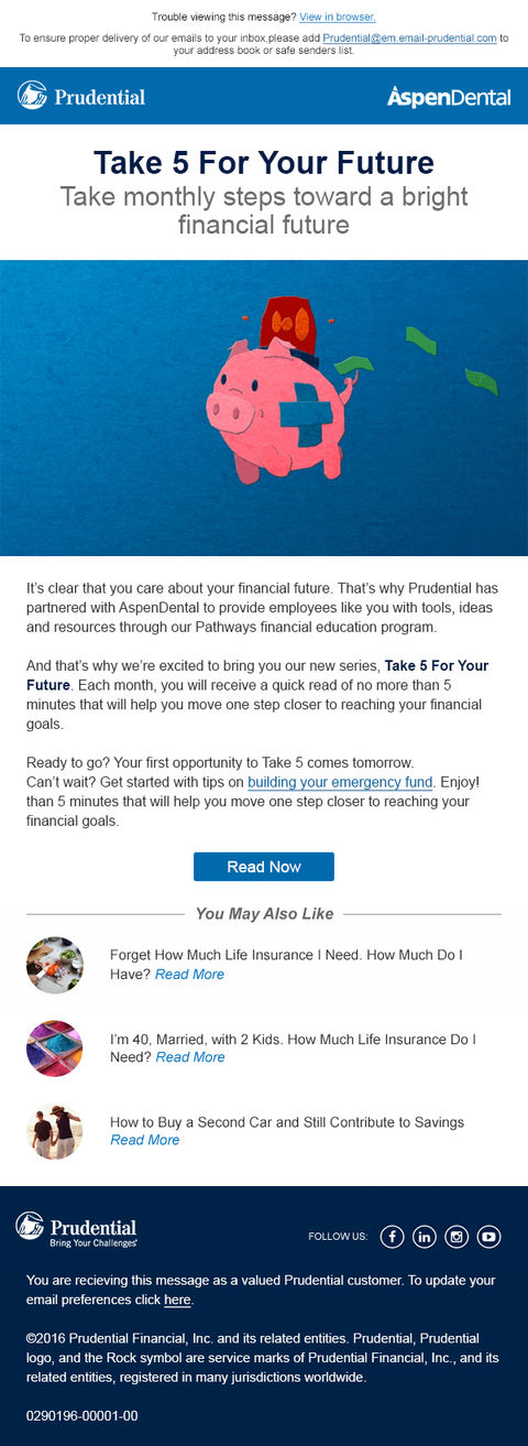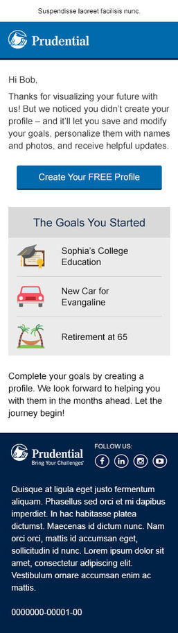 In late 2015, after the new Prudential site was launched, the marketing department wanted to create new emails that connected with the new look and feel of the site. This was easier said than done. Emails are complicated and yet simple; they are generally built using basic HTML language and with minimal clickable images so that customers who might be using outdated, corporate email programs can download them quickly and still get the information they need, even if the firewalls don’t allow images to be uploaded upon opening. Also, fonts must go back to the basic list from 1985 (we used Arial) so that the load time is not affected by looking for, downloading, and then uploading special fonts. Sure, we could have used text as an image, but again, if the server didn’t load the image, the message is lost.